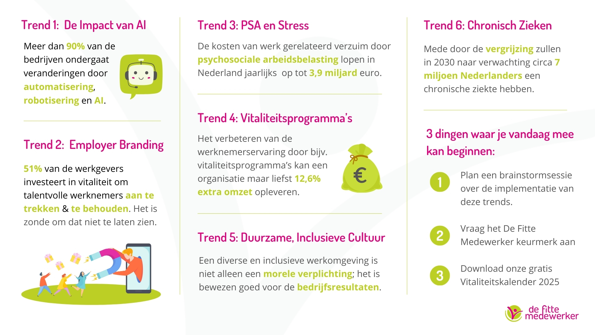 Ontdek praktische strategieën om jouw vitaliteitsbeleid toekomstbestendig te maken. Van het benutten van kunstmatige intelligentie voor betere inzichten en efficiëntie, tot het creëren van een inclusieve werkomgeving waarin iedereen floreert – deze trends bieden unieke kansen om jouw organisatie te laten groeien. Laat je inspireren door concrete voorbeelden en slimme tools die je helpen om van 2026 een succesvol en vitaal jaar te maken.